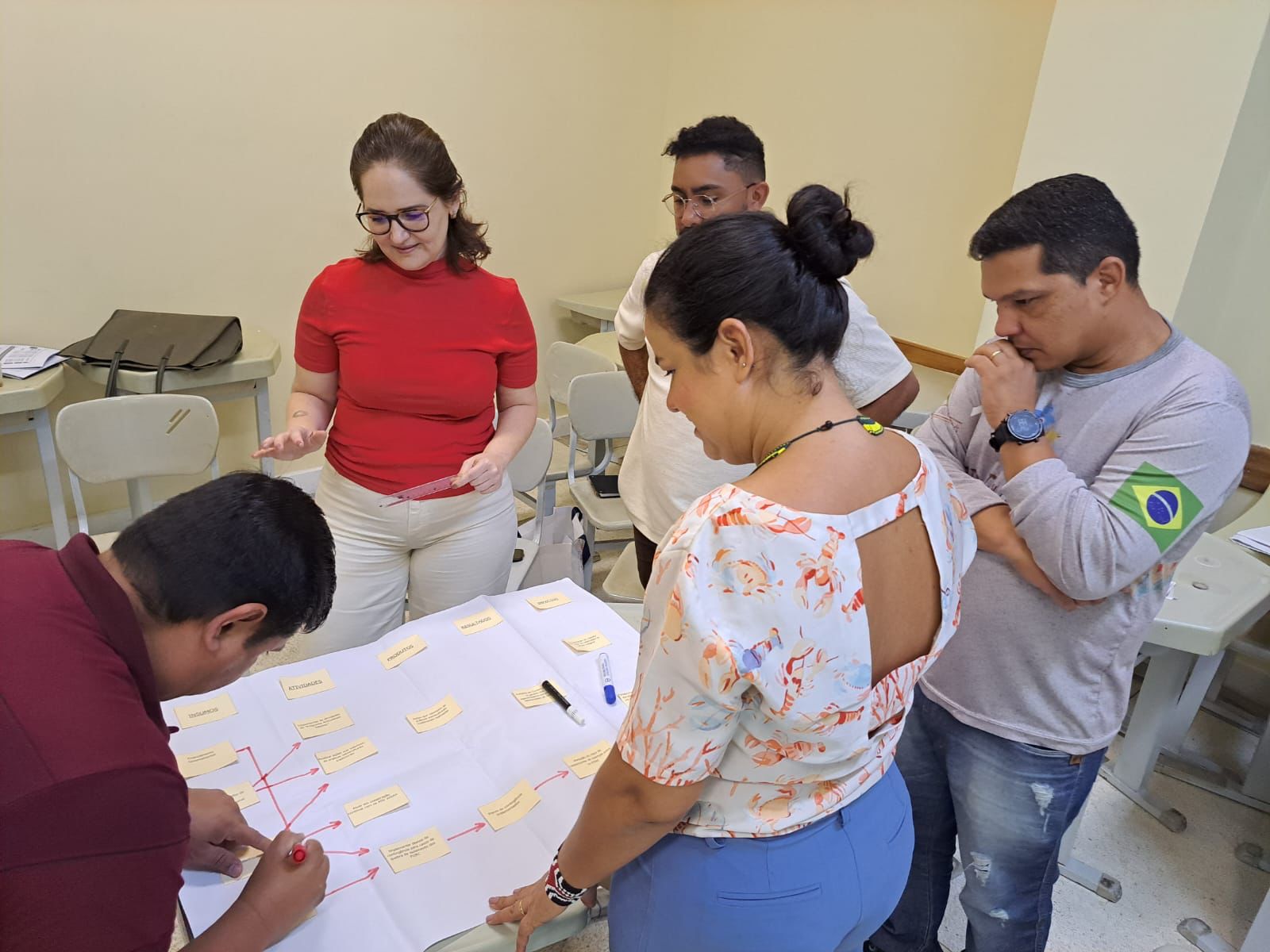 Grupo de participantes da Oficina de Monitoramento e Avaliação em Saúde Indígena na atividade de construção do modelo lógico da intervenção (2024). Créditos: Leticia Barbosa