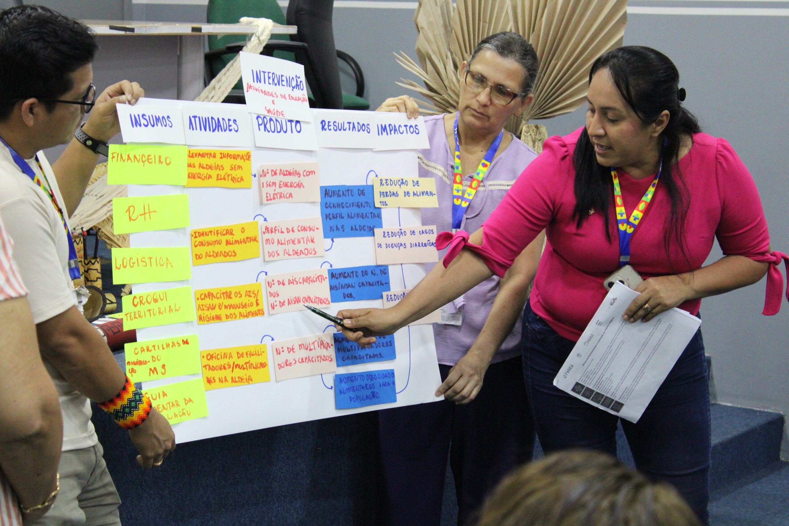 Participantes apresentam modelo lógico da intervenção estruturada pelo grupo durante a oficina realizada no DSEI Manaus, em novembro de 2024.